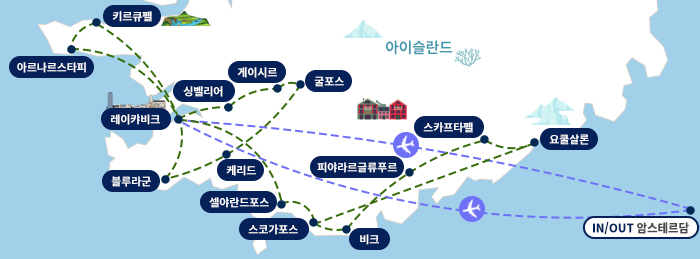 항공: 대한항공 탑승, 현지 장거리 이동 항공 4회 탑승, 호텔: 전일정 준특급 호텔 투숙, 식사: 북유럽의 대표 특식 및 전통식 제공, 핵심 관광지: 블루라군온천욕, 요쿨살론 유람선, 로젠보그 성 등, 관광도시: 레이캬비크, 굴포스, 게이시르, 싱벨리어, 블루라군, 스코가포스, 스카프타펠, 스비나펠스요쿨, 요쿨살롱, 비크, 프레드릭스보그, 코펜하겐