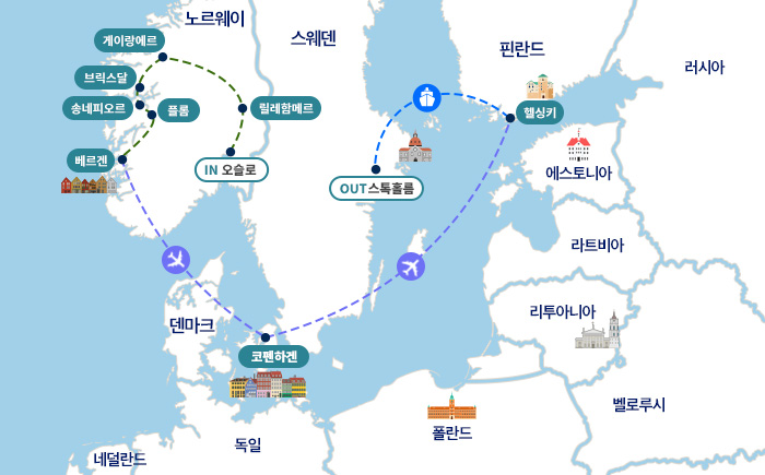 인천-오슬로(1)-릴레함메르-그로틀리(1)-게이랑에르-브릭스달-송네(1)-플롬-베르겐(1)-(항공이동)-코펜하겐(2)-(항공이동)-헬싱키-탈린크 실야라인 크루즈(1)-스톡홀름-기내(1)-인천